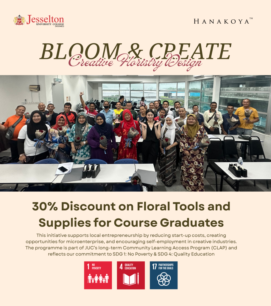 Kota Kinabalu, 10 October 2024 – Jesselton University College (JUC), in strategic collaboration with its industry partner Hanakoya, has officially launched the Floristry Start-up Assistance Programme, a flagship community-based initiative designed to empower aspiring florists from underserved and low income communities.