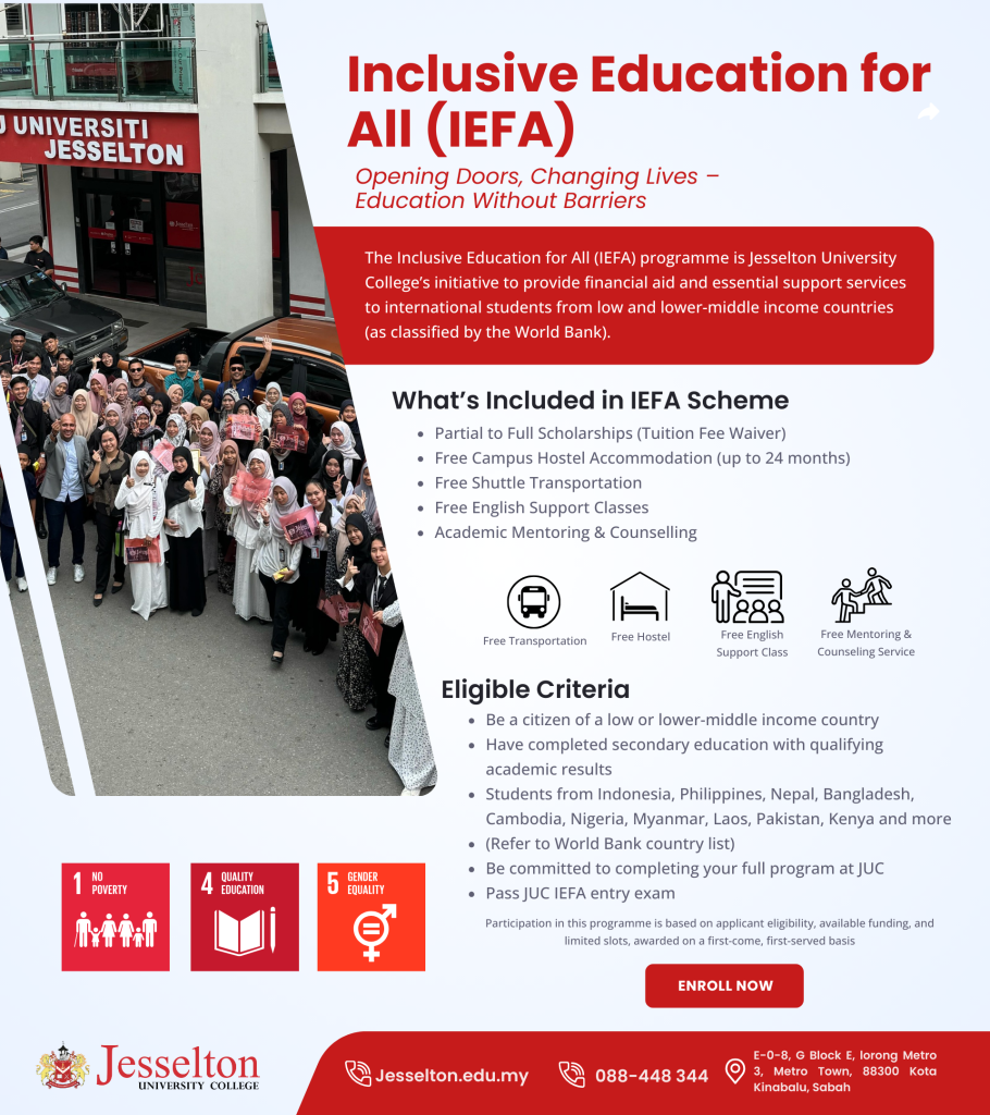 Kota Kinabalu, 29 November 2024 – Jesselton University College (JUC) has officially launched the Inclusive Education for All (IEFA) programme, a long-term institutional initiative designed to support international students from low and lower-middle income countries, as classified by the World Bank.