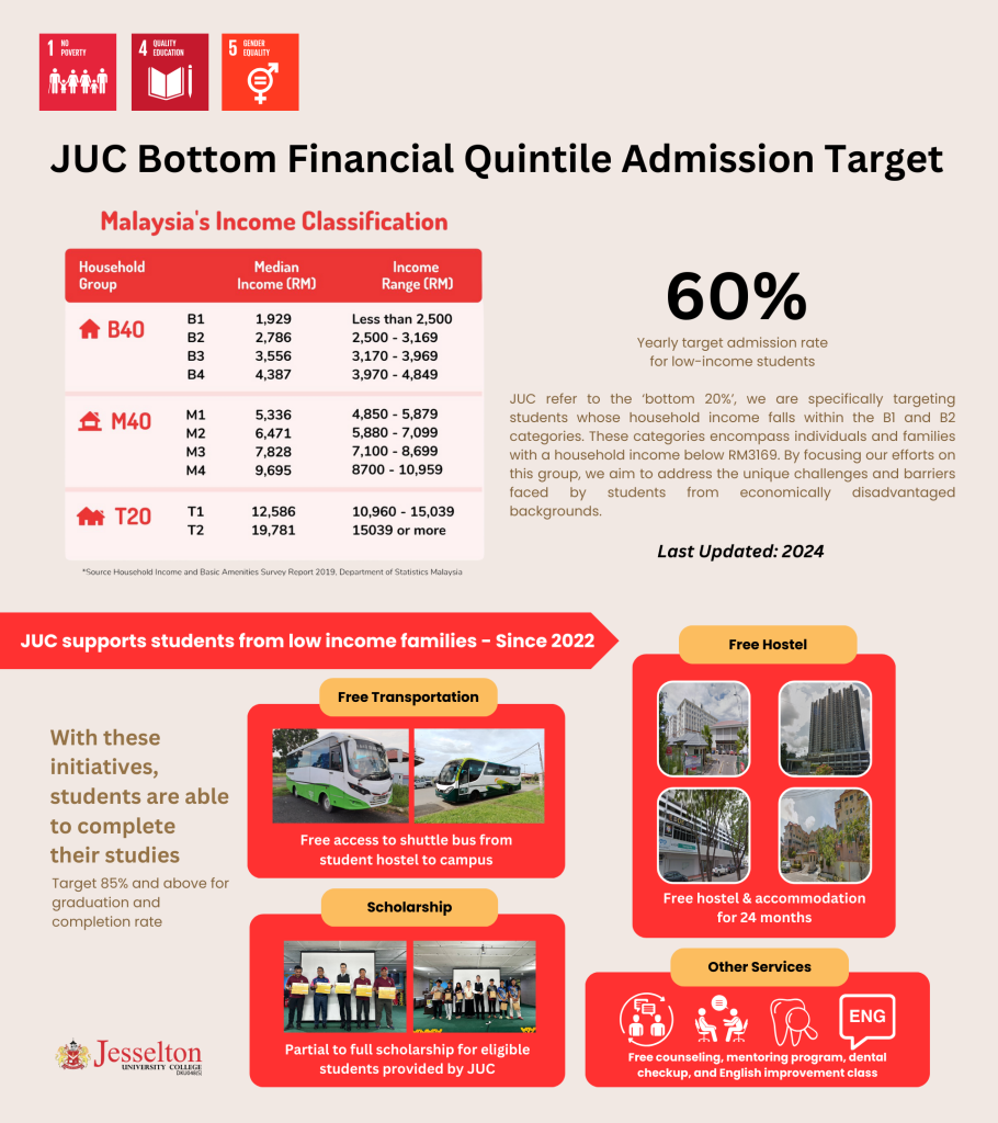 We have formally established a yearly admission target of 60% for students whose household income falls within the B1 and B2 categories of the B40 group, based on the official income classification by the Department of Statistics Malaysia. These two categories represent households earning less than RM3,169 monthly. JUC defines these students as belonging to the Bottom Financial Quintile, those most economically at risk of being excluded from quality tertiary education.