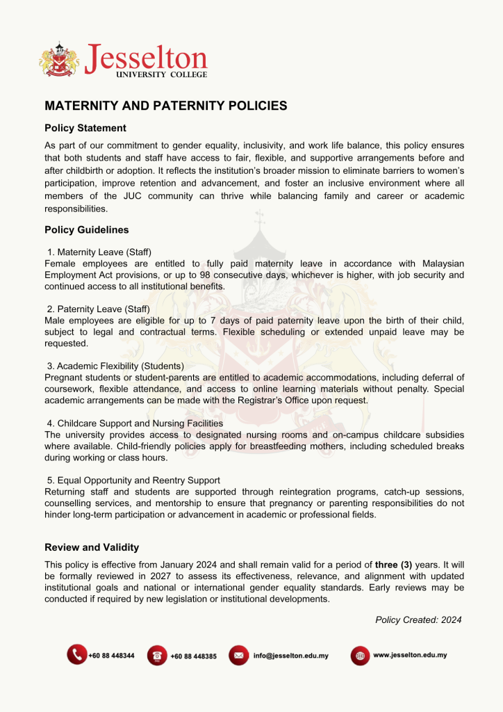 Jesselton University College (JUC) is pleased to announce the adoption of its Maternity and Paternity Policy, effective from January 2024. This policy represents JUC’s institutional commitment to fostering an inclusive, family friendly academic and working environment that supports women’s participation, advancement, and retention across all levels. It directly contributes to the achievement of the United Nations Sustainable Development Goals, particularly SDG 5 Gender Equality, SDG 4 Quality Education, and SDG 10 Reduced Inequalities.