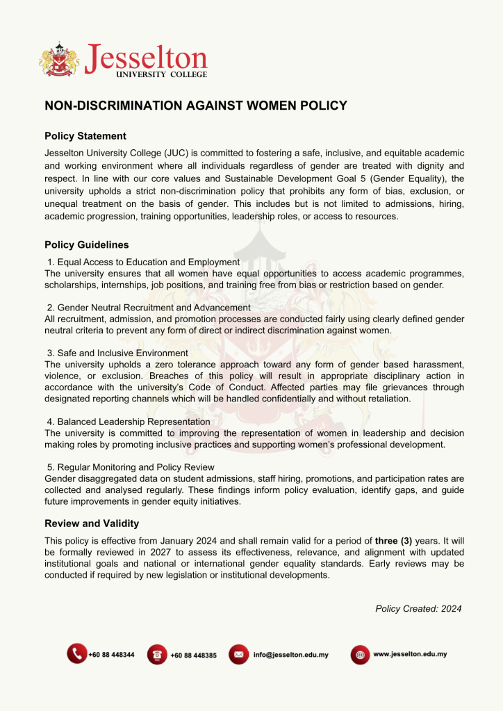 Jesselton University College (JUC) is deeply committed to promoting a safe, inclusive, and equitable academic and working environment for all individuals regardless of gender. In support of Sustainable Development Goal 5 (Gender Equality), JUC has officially implemented a comprehensive Non-Discrimination Against Women Policy, effective from January 2024. This policy was developed, approved, and published during the 2020 to 2024 period, and is publicly available as part of our institutional transparency and accountability framework.