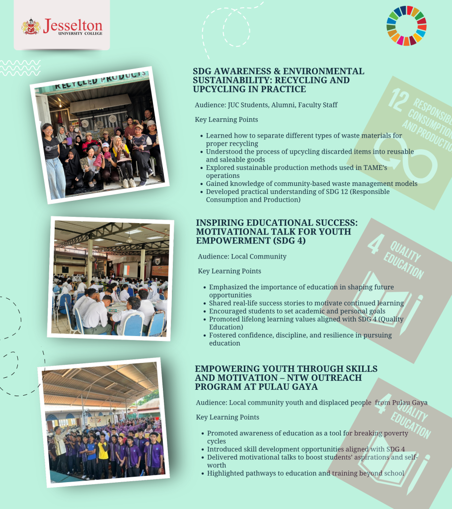 In alignment with SDG 4 (Quality Education), these outreach efforts are designed to promote sustainability values, knowledge sharing, and capacity-building among alumni, local residents, and displaced communities across Sabah.
