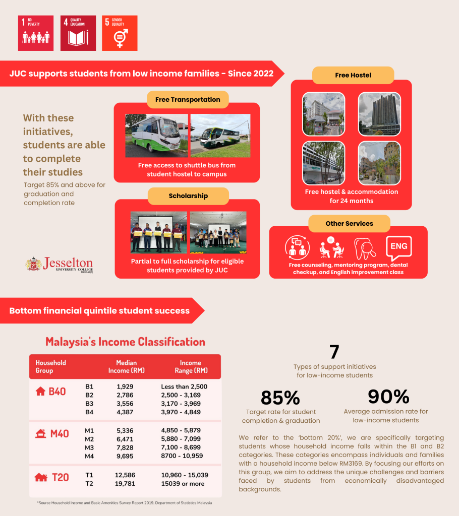 Jesselton University College (JUC) is deeply committed to ensuring that students from the lowest income households can access, pursue, and successfully complete their education. Since 2022, JUC has implemented a long-term institutional support programme specifically designed to assist students whose household income falls within the B1 and B2 categories of Malaysia’s income classification, commonly referred to as the bottom 20 percent income group (monthly household income below RM3,169).